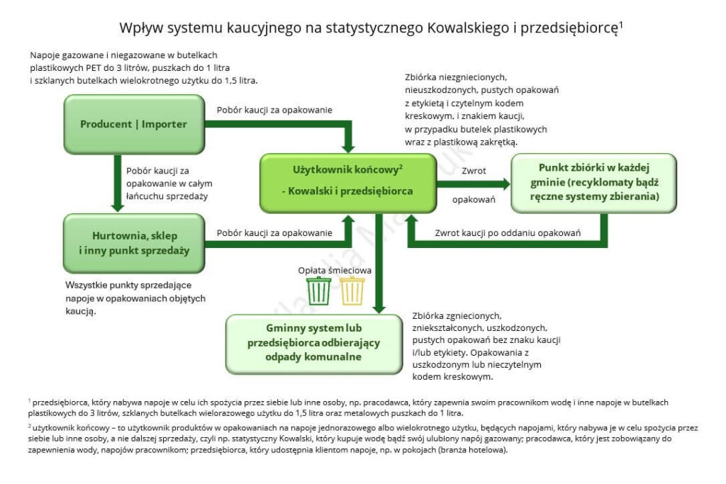 Jeśli należysz do jednej z wymienionych grup, warto poznać zasady, dzięki temu unikniesz zbędnych kosztów i przygotujesz się na start systemu kaucyjnego. Zobacz poniższy schemat, który pokazuje najważniejsze elementy z perspektywy konsumenta. Podobny system działa już od wielu lat w zakresie szklanych butelek wielokrotnego użytku. Dzisiaj Kowalski i przedsiębiorca, jako użytkownik końcowy, płaci kaucję za szklaną butelkę i odzyskuje ją, gdy odda puste opakowanie do punktu sprzedaży. Tak samo będzie w przypadku opakowań jednorazowych: metalowych puszek i plastikowych butelek. Jednak różnica będzie taka – puste opakowanie oddasz w każdym punkcie zbiórki i to bez paragonu, ale musisz spełnić kilka wymagań.